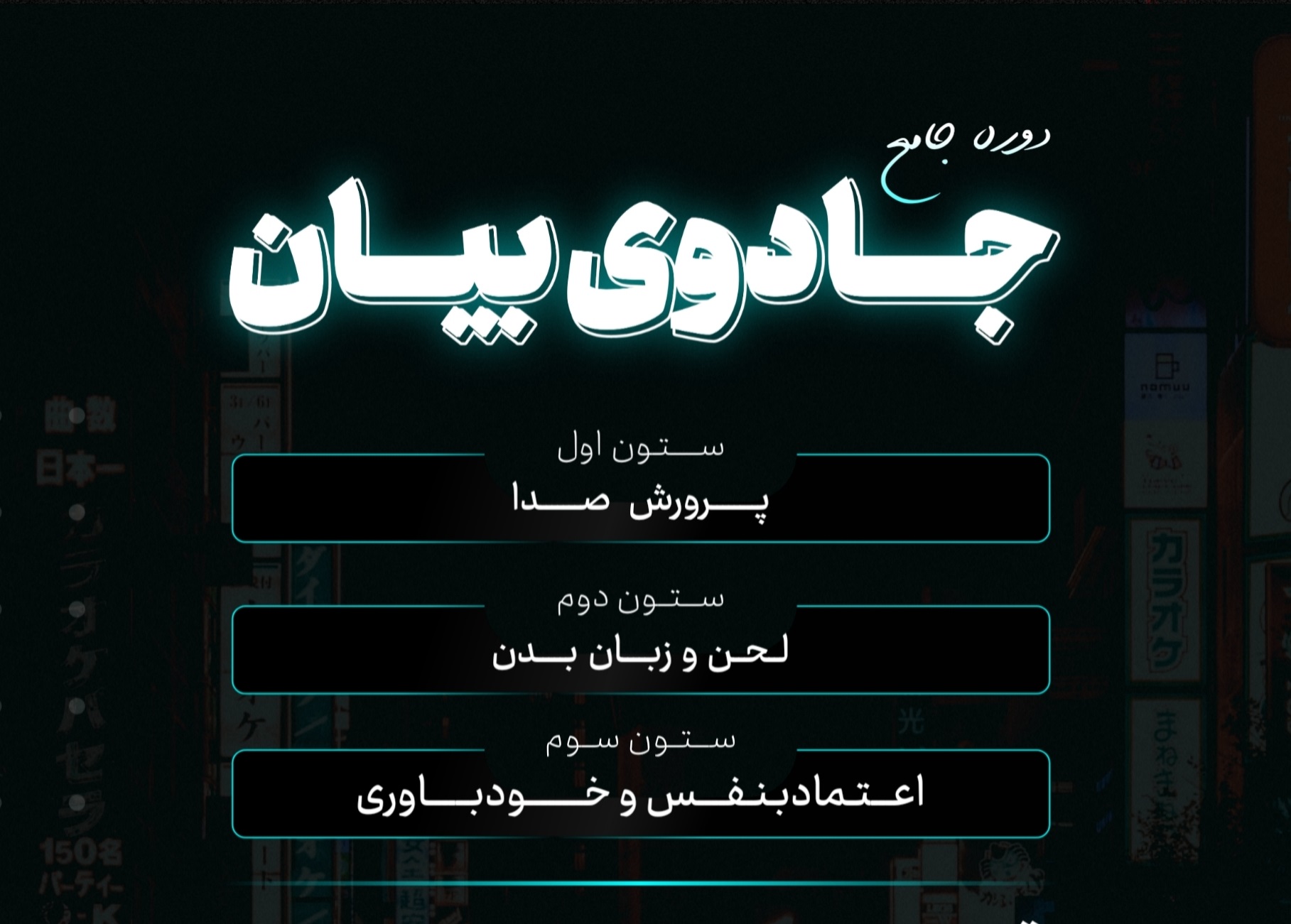 خوشحالیم که شما را در بین دانشجویان دوره ” جامع «جادوی بیان» ” می بینیم. در این دوره شما فن بیان را از پایه بصورت کاملا حرفه ای یاد می‌گیرید،دوره جامع «جادوی بیان» شامل سه ستون است.